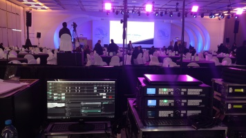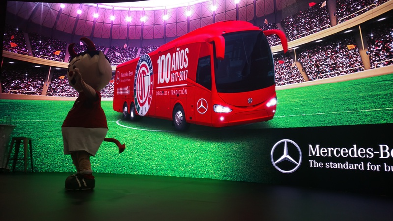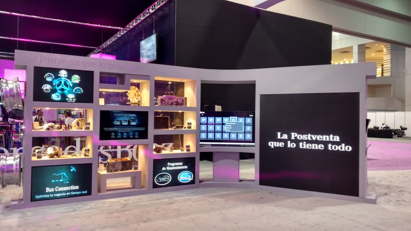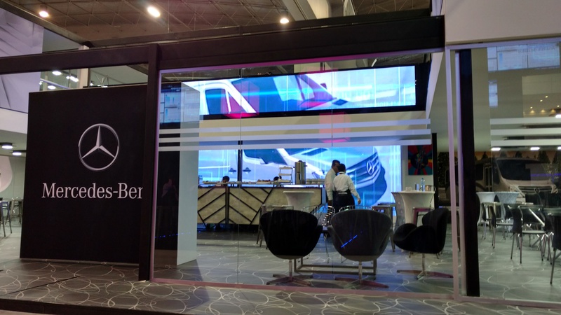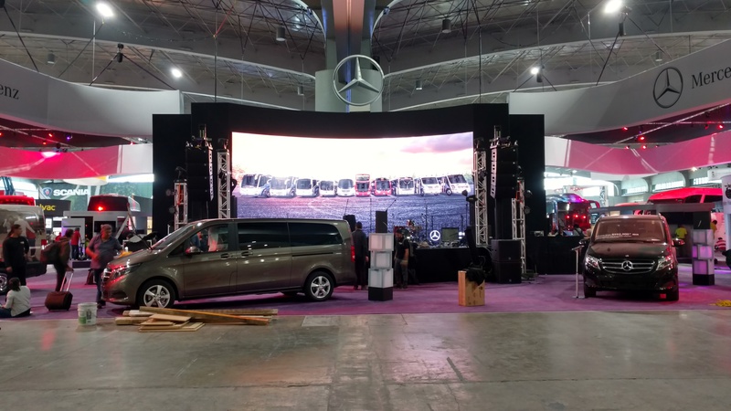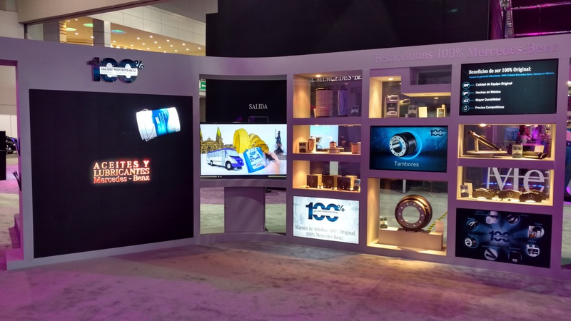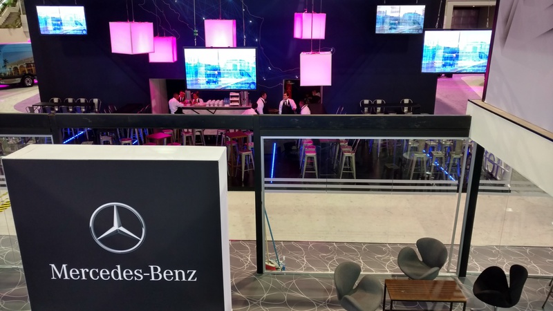 Mercedes Benz en Expo Foro: 3 escenarios con pantallas LED, monitores y audio. Túnel de pantalla LED